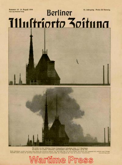 Titelseite: Die ersten von der britischen Zensur freigegebenen Aufnahmen eines ,,V 1”-Einschlages im Herzen von London: Unbeirrbar, unbeeinflußbar stürzt die Flügelbombe auf ihr Ziel.