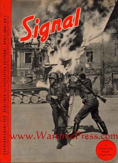 Signal was the Wehrmacht’s internationally distributed propaganda magazine, published in up to twenty languages for neutral and occupied countries. This inaugural 1940 issue — produced on the eve of the western campaign — combines military reportage, political-economic analysis, human-interest features, and striking photography, including nine color plates. The tone throughout is confident and propagandistic: Germany is portrayed as economically self-sufficient, militarily superior, and fighting a defensive war against British financial hegemony.