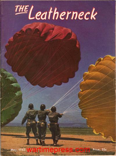 Vol. XXVI No. 5 ……. Cover: Paramarines are pictured landing bright-colored cargo chutes at Camp Lejeune, New River. ……. Inside Articles: ……. Under New Management by DeGrasse (cartoon) ….. Desert Victory (pictorial) ….. Carry On (letters) ….. Straight Dope (humor) ….. Gizmo and Eightball by Fred Rhoads (cartoon) ….. Onslow Beach (sketches) ….. Devil Dog School by Frank X. Tolbert (article) ….. Interviews (Girl Marine) ….. Ship’s Bells by M. J. Smith (article) ….. Death to the Invaders by F. R. Crumbie, Jr. (semi-fiction) ….. Memoirs of P. I. (cartoon) ….. Weapons Quiz (pictorial) ….. Navy Corpsmen by M. F. Irwin (article) ….. Strictly G-2 by DeGrasse (cartoon) ….. Marine Hymn (new piano arrangement) by Luis Guzman ….. The Old Sand Cure (humor) by Fred Rhoads ….. GIST of the Month’s News ….. About the “Honor Men” ( article on Colonel John Groff ) …..Short Shorts on Marines ….. Citations ….. Gyrene Gyngles ….. Detachments ….. Scuttlebutt Splashes ….. Casualties List March 1, 1943 to April 1, 1943 – Dead and Missing ….. Dis-missed !