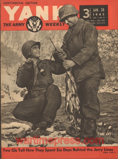 Cover: Time Off — These GI Fishermen used a grenade instead of a pole to get a mess of fish for their dinner. Shown by a mountain stream in Luxembourg are Pvt. Bill Weaver of West Point, Tenn., and T-5 Walter B. Komenick of Marathon, Wis. ……. Two GIs Tell How They Spent Six Days Behind the Jerry Lines