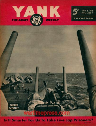 Cover: Carrier Catapult – On an aircraft carrier in the Pacific, Sgt. Lonnie Wilson of YANK, photographs a catapult take-off. The carrier’s 5-inch guns frame the picture. .